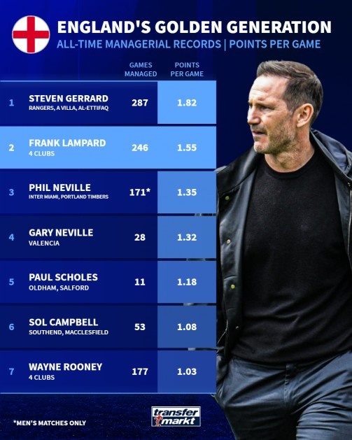 英格兰黄金一代持教场均积分:杰拉德1.82分最高,鲁尼1.03分最低