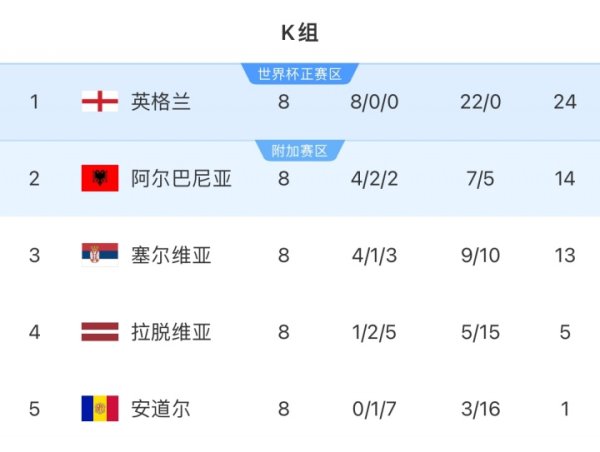 11月17日讯 世初赛欧洲区K组8轮比赛一起适度,英格兰8轮全胜,轰22球0失球收官,10分上风断档第一,见效纵贯2026寰宇杯! 阿尔巴尼亚4胜2平2负积14分位居第二,仅1分上风跨越死后的塞尔维亚取得附加赛阅历!......查看更多