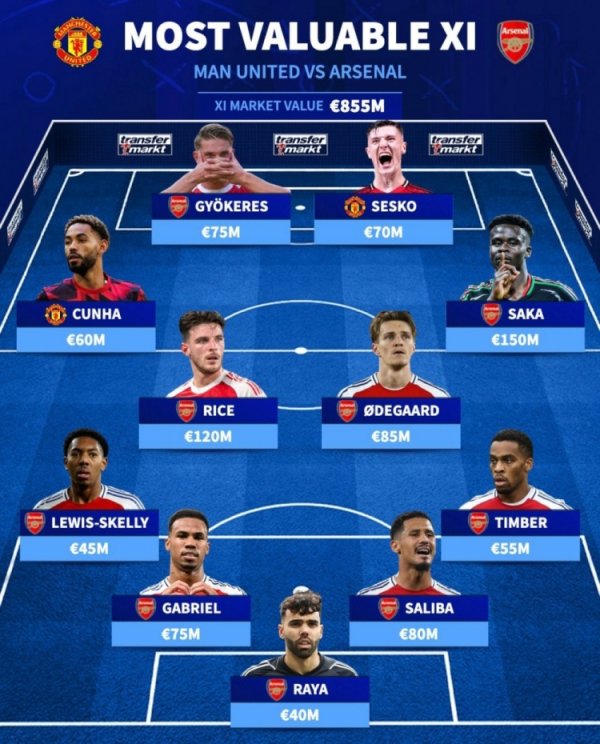 德转列曼联+阿森纳身价最高阵:萨卡领衔阿森纳9东说念主,塞斯科在列