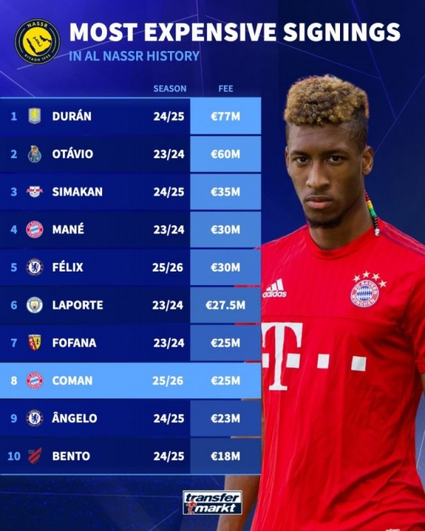利雅得告捷最贵引援榜:杜兰7700万欧居首,科曼2500万欧比肩第7