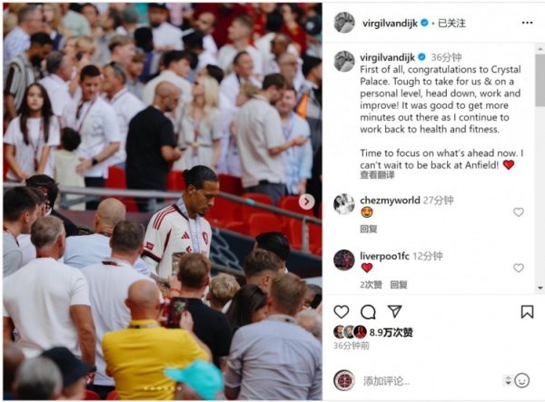 8月11日讯 社区盾杯比赛,利物浦点球大战不敌水晶宫,无缘冠军。 利物浦队长范迪克社媒写说念:“领先要祝愿水晶宫。对咱们来说,这是一个难以汲取的效能;对我个东说念主而言,也要不务空名,致力责任并陆续普及!在我赓续规复健康和体能的流程中,或者得回更多的比赛手艺是件功德。 现时是时候专注于将来的比赛了,我迫不足待思回到安菲尔德!”......查看更多