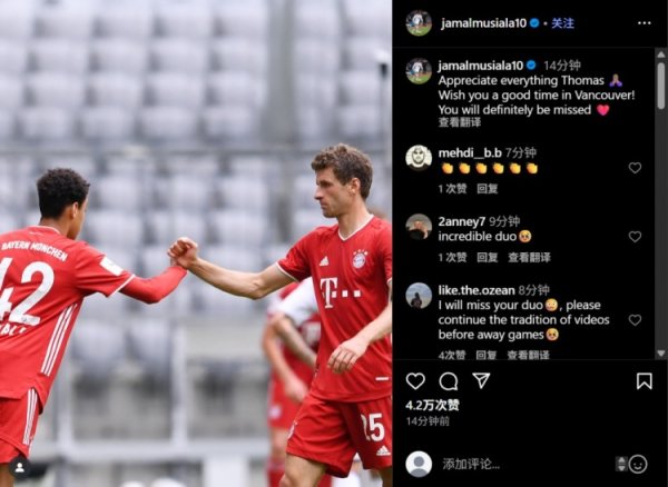 8月12日讯 35岁的穆勒夏窗离开拜仁,加盟温哥华白浪,穆西亚拉更新个东说念主社媒晒出两东说念主合照,为穆勒奉上祈福。 穆西亚拉社媒写说念:感谢你所作念的一切托马斯🙏🏽祝你在温哥华一切奏凯,一定会思念你的❤️......查看更多