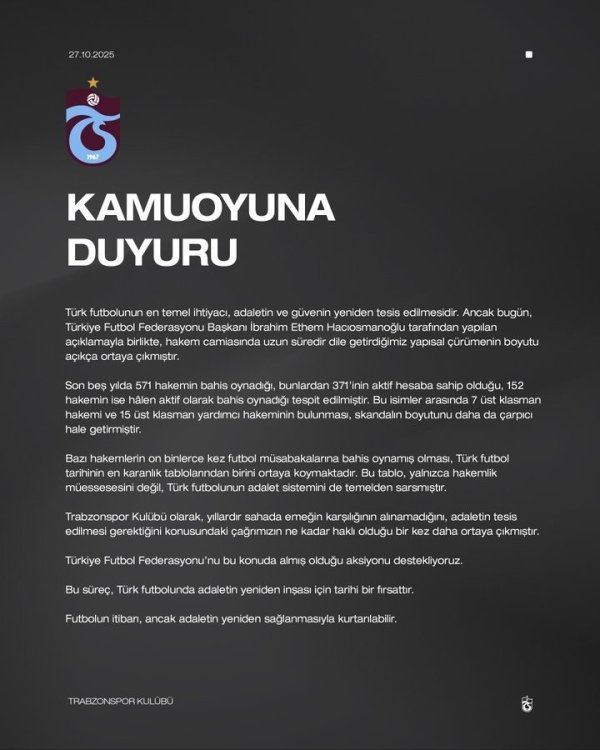 10月27日讯 土超特拉布宗俱乐部发表公开声明,回答土耳其足协主席哈奇奥斯马诺格鲁所揭露的裁判界“结构性退步”问题。 特拉布宗俱乐部发布公开声明 土耳其足球最根柢的需求是重建正义和信任。可是,今天,土耳其足协主席易卜拉欣-埃特姆-哈奇奥斯马诺格鲁发表了声明,了了地揭示了咱们永恒以来在裁判界内所指出的结构性退步程度。 经查明,在往时五年中,有571名裁判参与了博彩,其中371东谈主领有活跃账户,152名裁判当今仍在积极参与博彩。事实上,这些东谈主中包括7名顶级裁判和15名顶级助......查看更多