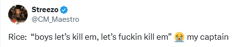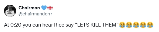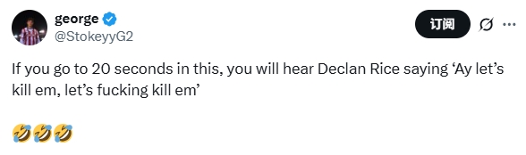 在埃泽下半场刚开场打进第二球,阿森纳3-0普实时,赖斯在与队友庆祝时朝队友喊谈:“嘿!让咱们杀了他们,他X的杀了他们吧!”好多球迷在外交媒体指出,转播镜头昭彰捕捉到了赖斯的这句话。