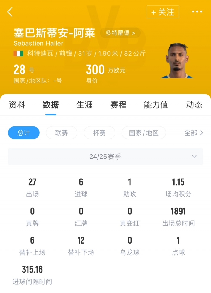 上赛季,阿莱为多了得场27场,取得了6粒进球和1次助攻,现在其德回身价为300万欧。
