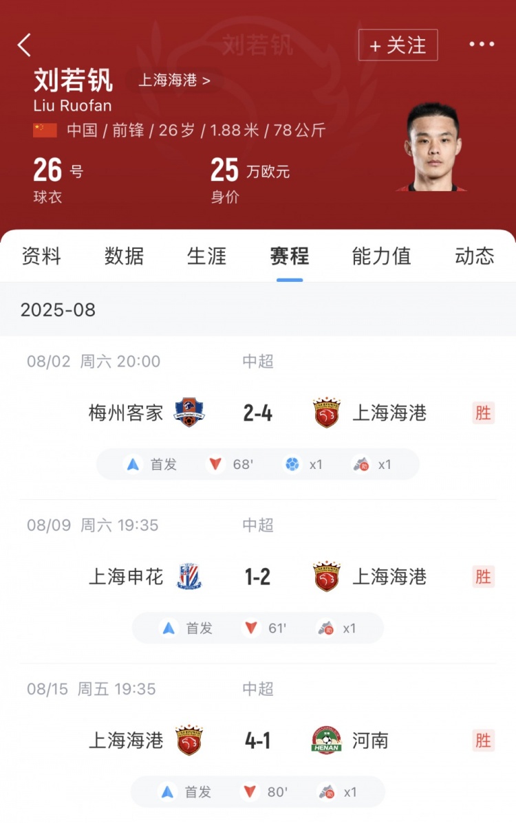 在8月也曾进行的3场比赛中,上海海港先后顺服梅州客家、上海申花和河南队。其中刘若钒在对阵梅州的比赛里孝顺1传1射,其他2场比赛则各有1个助攻。