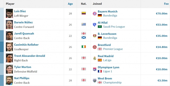 利物浦今夏球员出售情况(以为约2.253亿欧,不算浮动)↓