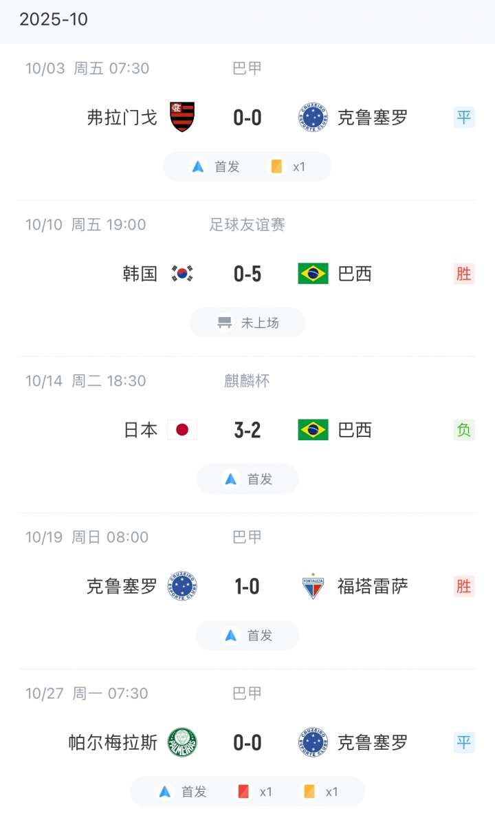 战日本狂耸立!克鲁塞罗中卫布鲁诺入选巴西名单,上轮联赛刚染红