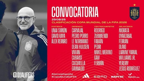 08月29日讯 西班牙国度队公布了新一期球员名单,亚马尔领衔,复出的卡瓦哈尔、罗德里纪念,莫拉塔、赫伊森、苏维门迪等球员入选。西班牙国度队将建造9月份进行的世初赛欧洲区比赛。 西班牙名单: 门将:西蒙(毕巴)、拉亚(阿森纳)、雷米罗(皇社) 后卫:卡瓦哈尔(皇马)、波罗(热刺)、勒诺尔芒(马竞)、赫伊森(皇马)、维维安(毕巴)、库巴西(巴萨)、库库雷利亚(切尔西)、格里马尔多(勒沃库森) 中场:罗德里(曼城)、苏维门迪(阿森纳)、法比安(巴黎)、佩德里(巴萨)、梅里诺(阿森纳......查看更多