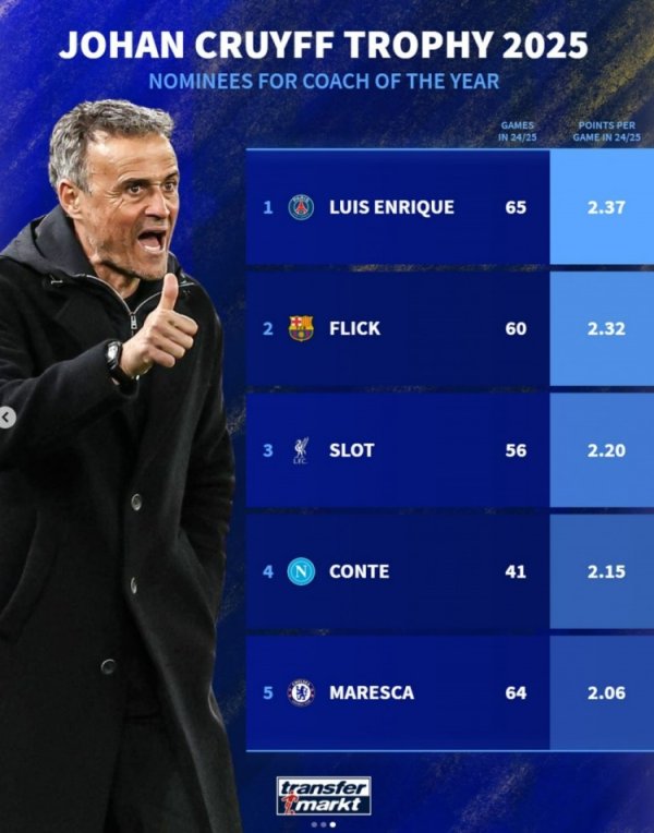 克鲁伊夫奖候选主帅带队场均积分榜:恩里克居首,弗里克次席