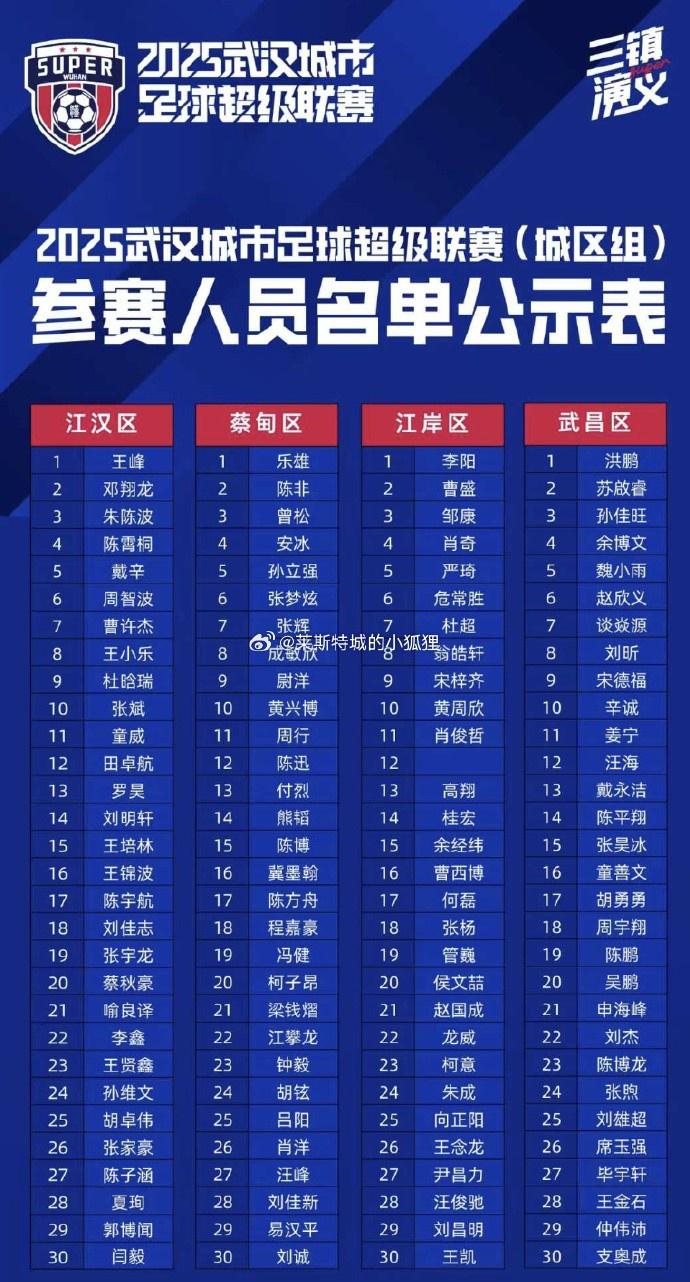直播吧8月14日讯 据博主“莱斯特城的小狐狸”明白,武汉城市足球联赛公布了参赛球员名单,并未出当今名单之中。