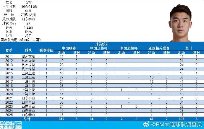 直播吧8月17日讯 据博主“FM大连球队拜谒员”统计,山东泰山球员石柯在泰山客场对阵新鹏城的比赛中,完成个东说念主在中国顶级联赛出场300场的里程碑,成为第52位结束此项设立的球员,93年齿段第1东说念主。