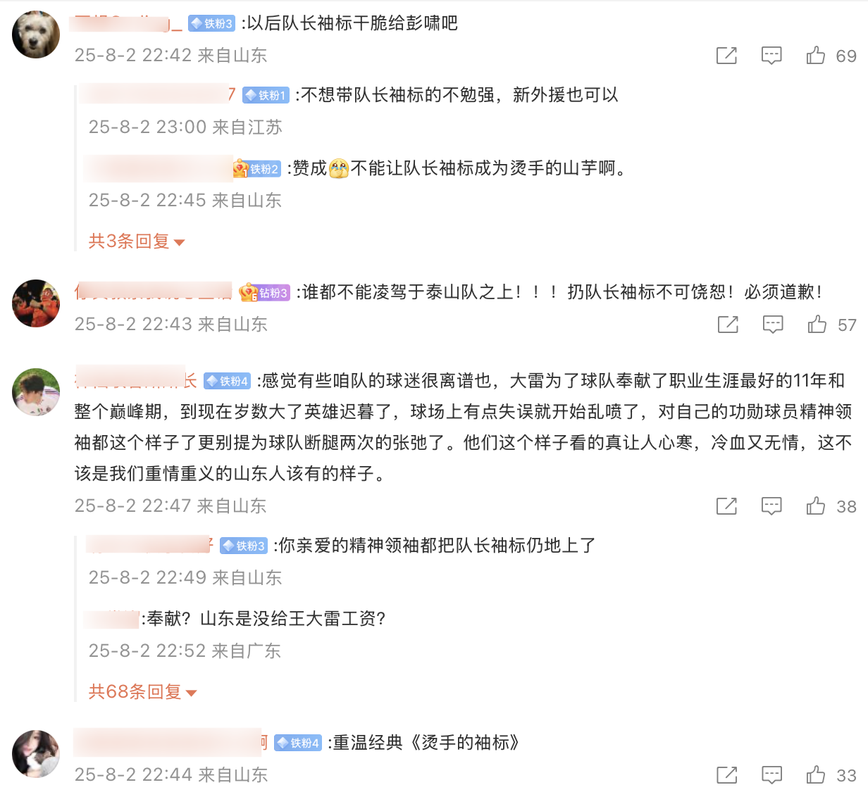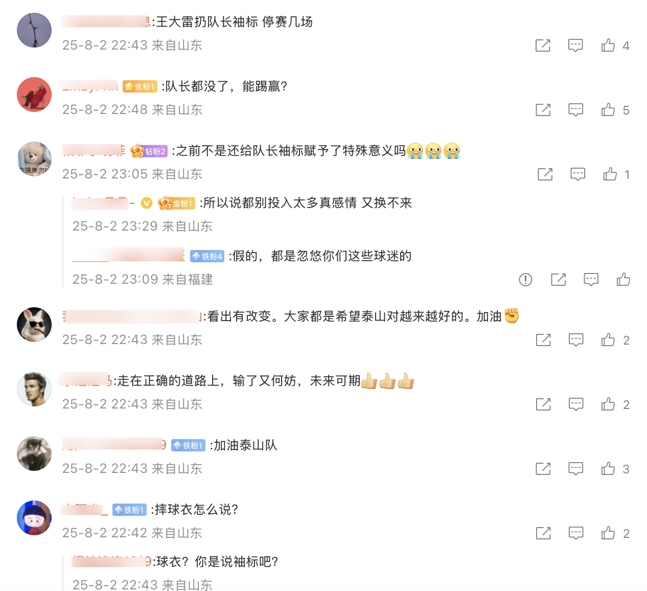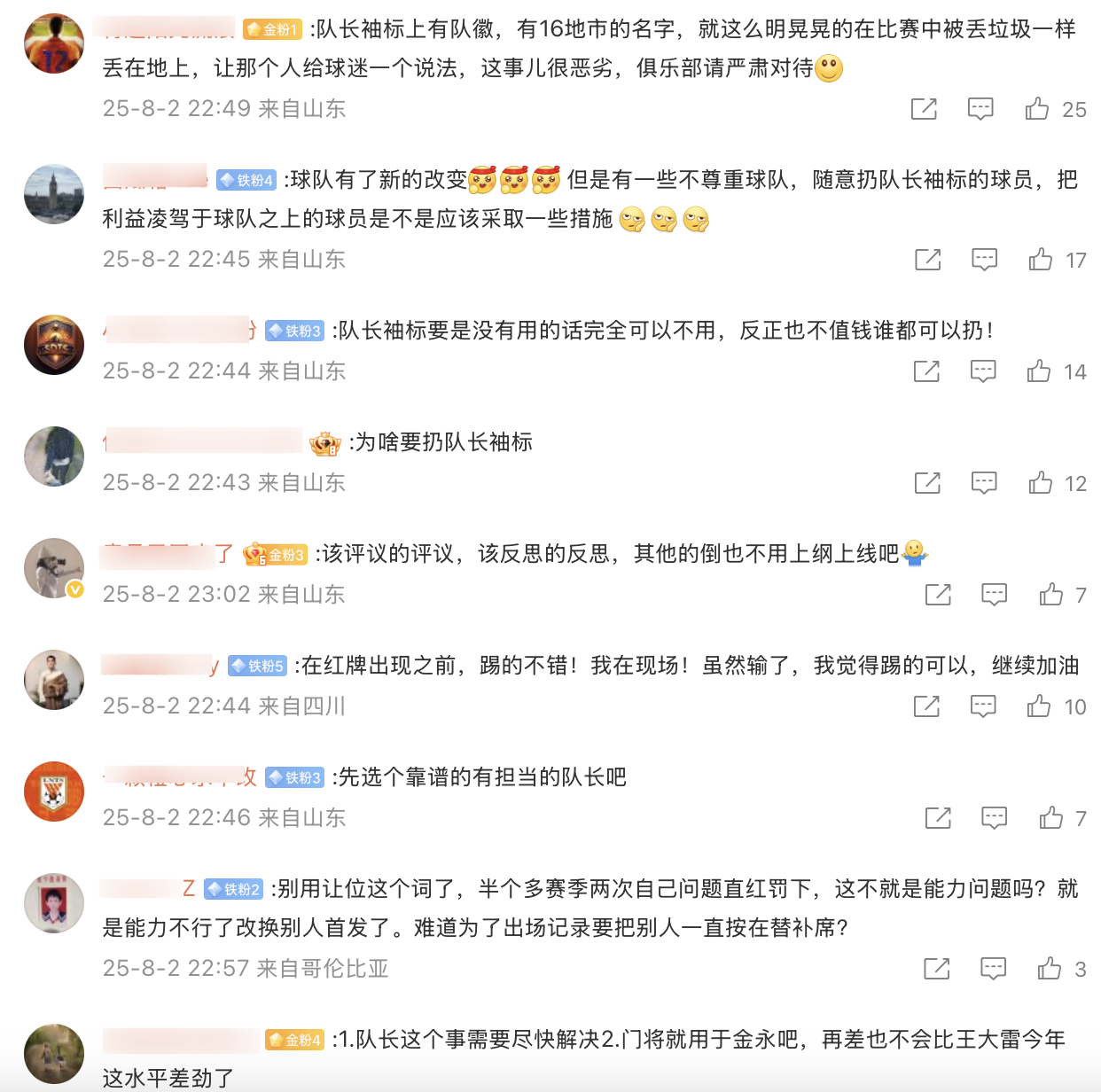 王大雷染红后怒扔队长袖标,泰山球迷在俱乐部官博接头区刷屏抒发不悦